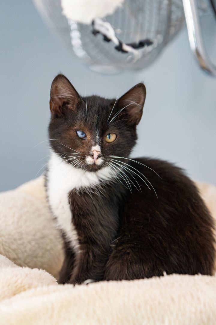 Krokiet - czarny z białym krawatem chłopczyk urodzony w lipcu 2025. Jest przepięknej urody dostojnym kocurkiem. Przeszedł koci katar, który pozbawił go widzenia w jednym oku, drugie jest zdrowe.