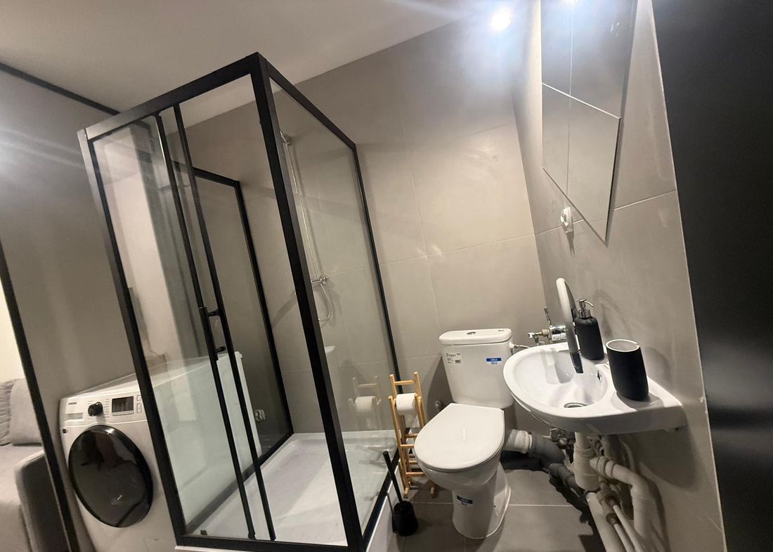 Łazienka: kabina prysznicowa, umywalka, WC