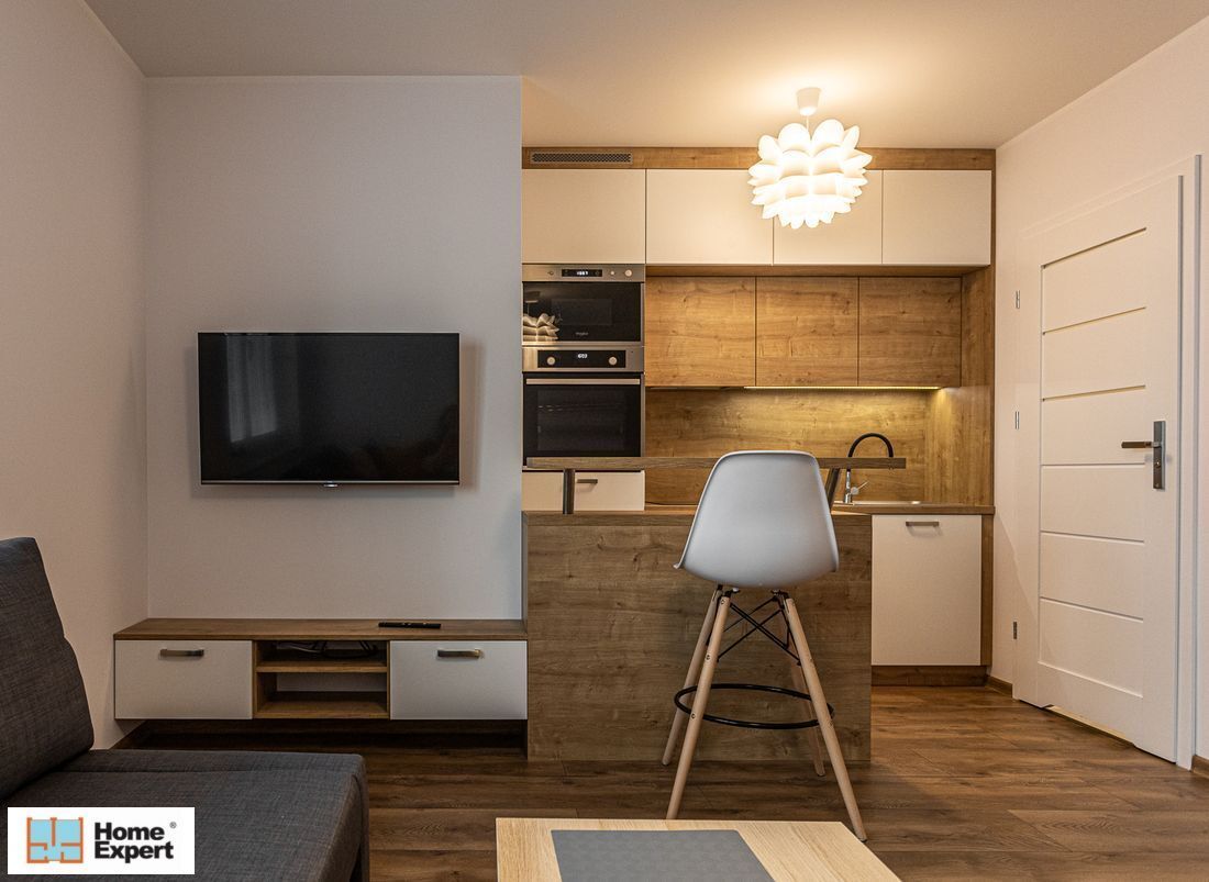 Strefa dzienna z rozkładaną sofą, stolikiem RTV i Smart TV.