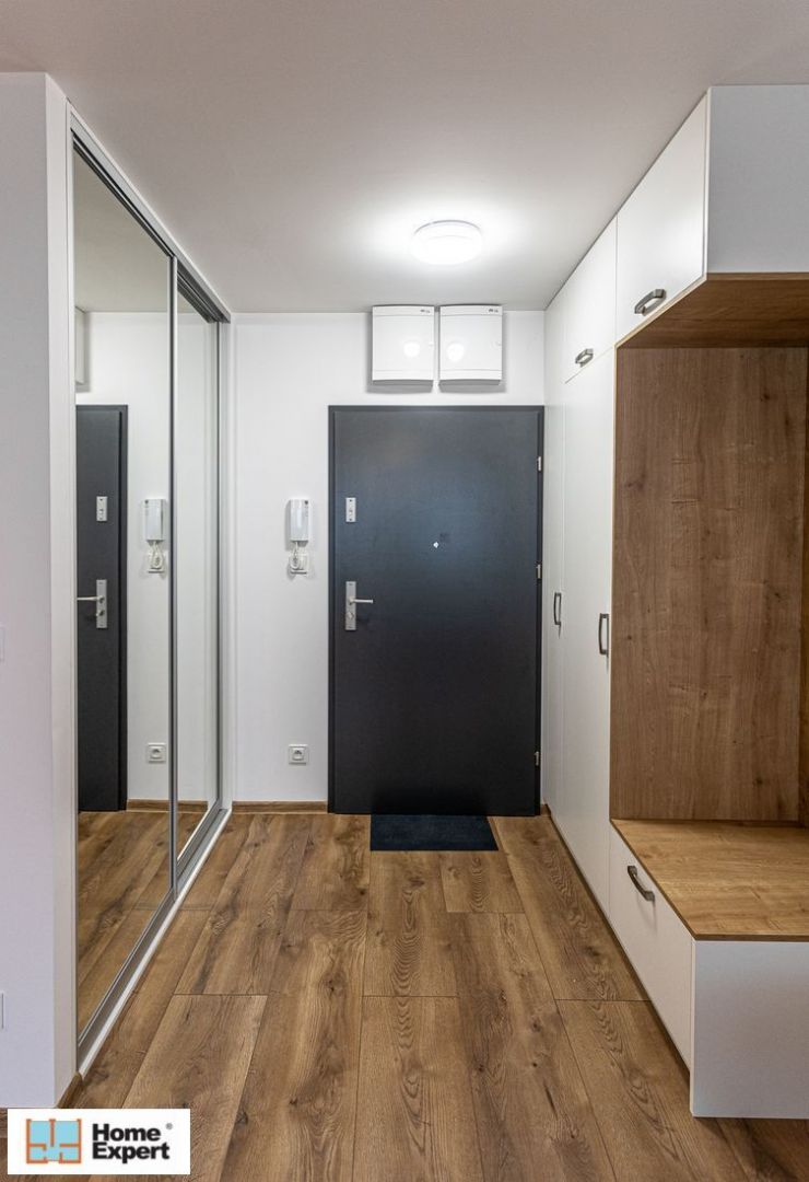 Przestronny przedpokój z dużymi szafami wnękowymi z lustrami oraz garderobą.