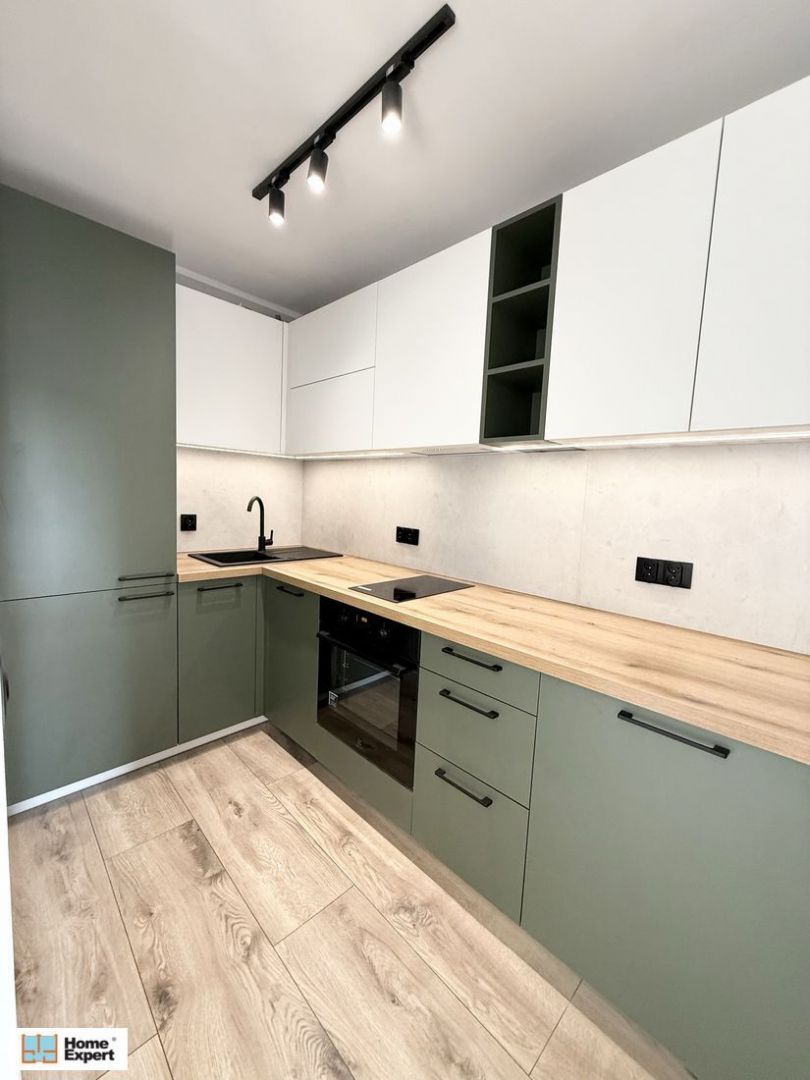 Kuchnia wykonana na wymiar przez stolarza – nowoczesne fronty Kronospan, solidne zawiasy Blum. W pełni wyposażona w sprzęt AGD w zabudowie: lodówka, zmywarka, piekarnik, płyta indukcyjna, okap, pralka (Samsung, Electrolux, Whirlpool).