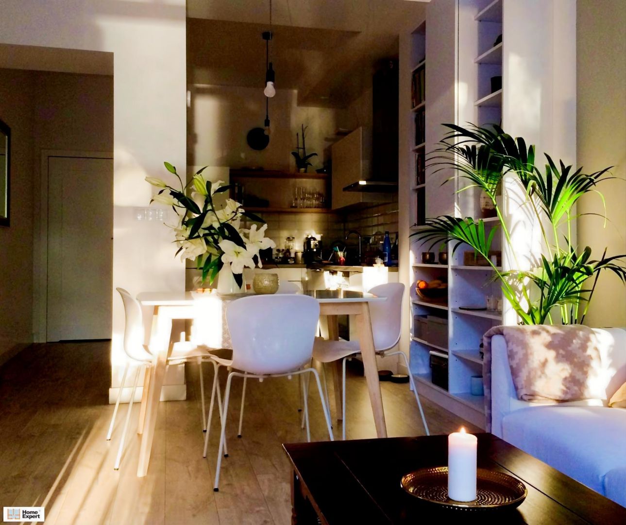 Salon z aneksem kuchennym został funkcjonalnie rozdzielony stylową kolumną, tworząc spójną,