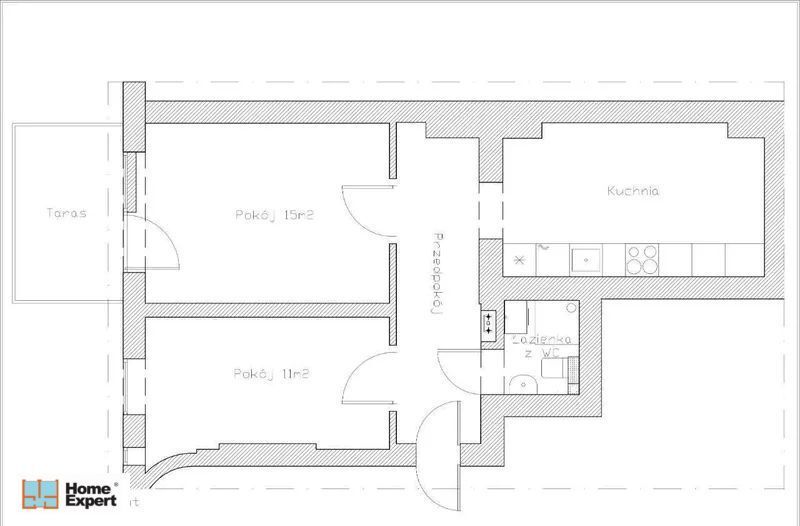 Układ zawiera obszerny przedpokój, dwa pokoje o powierzchniach 15 m2 i 11m2, niezależną kuchnię oraz łazienkę z WC (rzut mieszkania w zdjęciach załączonych do oferty).