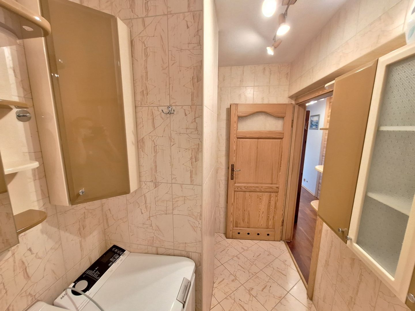 korytarz-podłoga merbau, szafy – jasny bambus, ,podłoga w sypialni- grab.