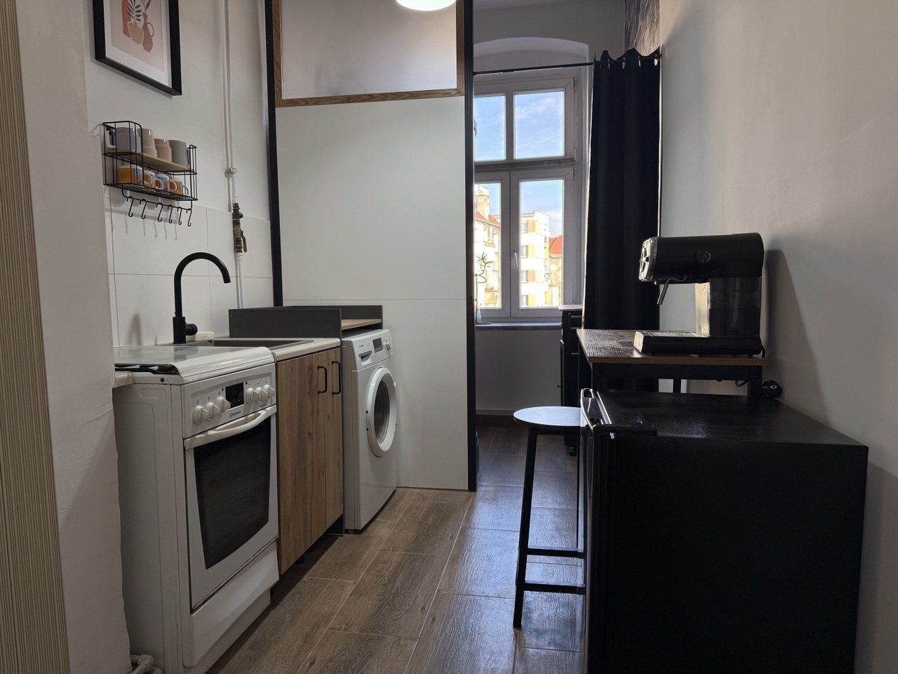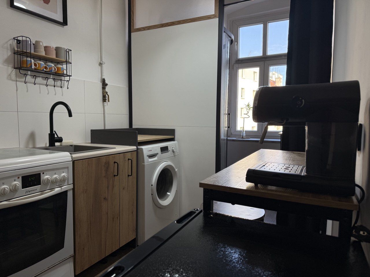 funkcjonalna kuchnia połączona z łazienką.