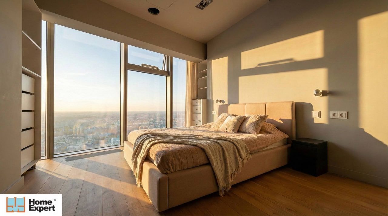 2. Sypialnia: Oaza spokoju z ogromnym przeszkleniem, z którego rozpościera się widok na panoramę miasta i zachody słońca.