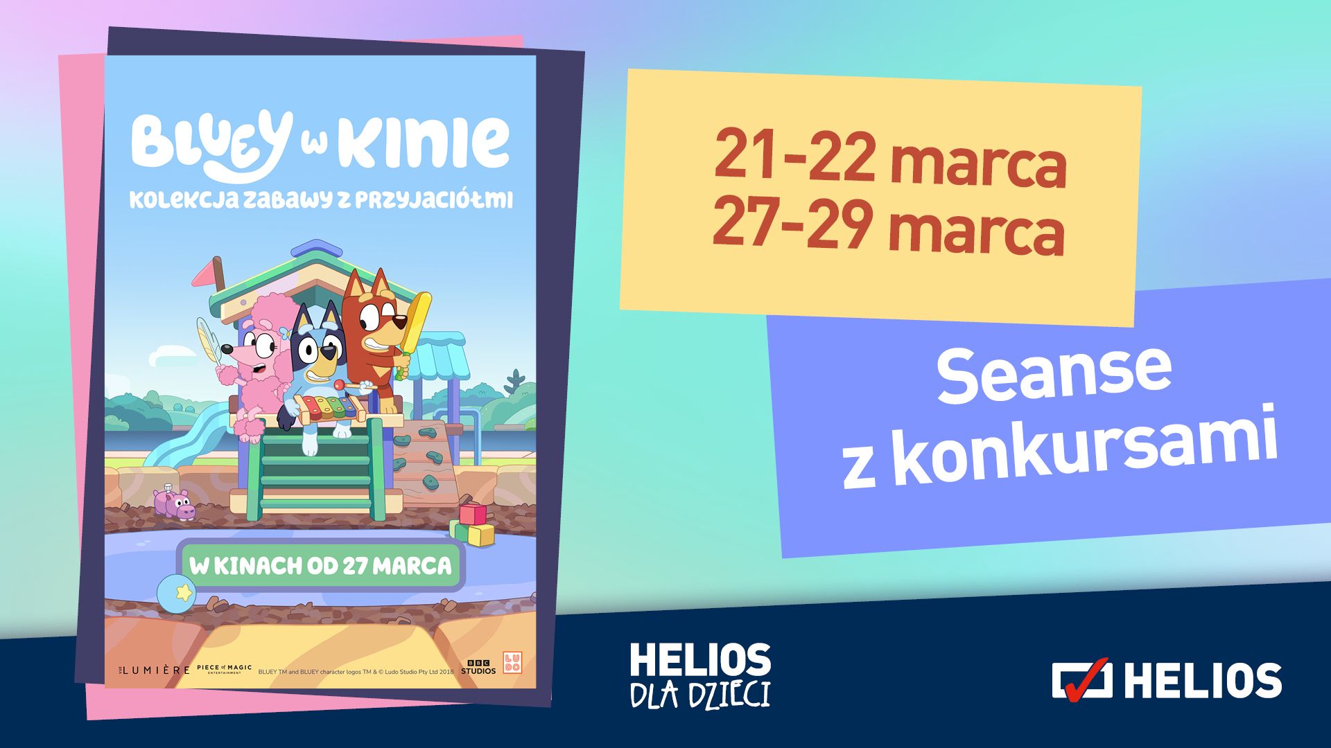 Kina Helios Wrocław Magnolia Park i Helios Wrocław Aleja Bielany w dniach 21-22 oraz 28-29 marca 2026 o godzinie 10:30 i 12:00 zapraszają na seanse z konkursami „Bluey w kinie: Kolekcja Zabawy z przyjaciółmi ”.