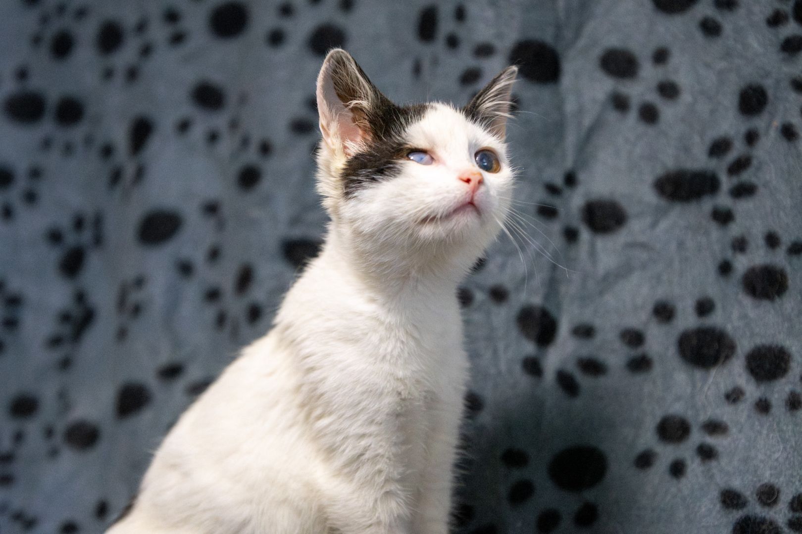 ILOCZYN – biały z czarnymi plamkami na głowie, malutki, wyluzowany, mruczący, urzekający urodą kocur. Urodzony w lipcu 2025