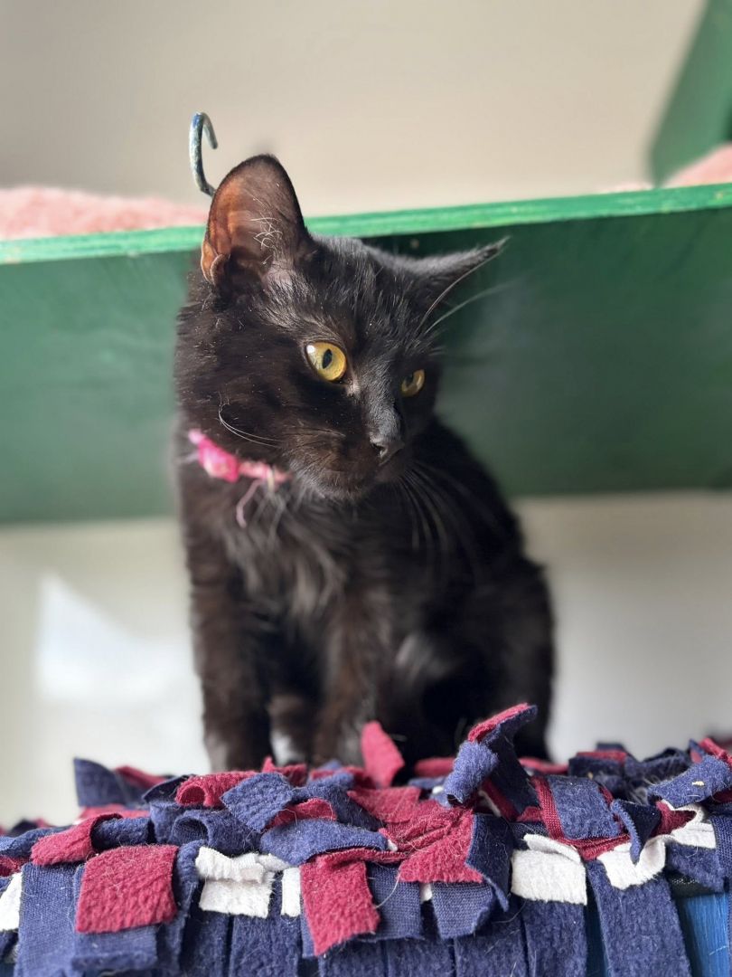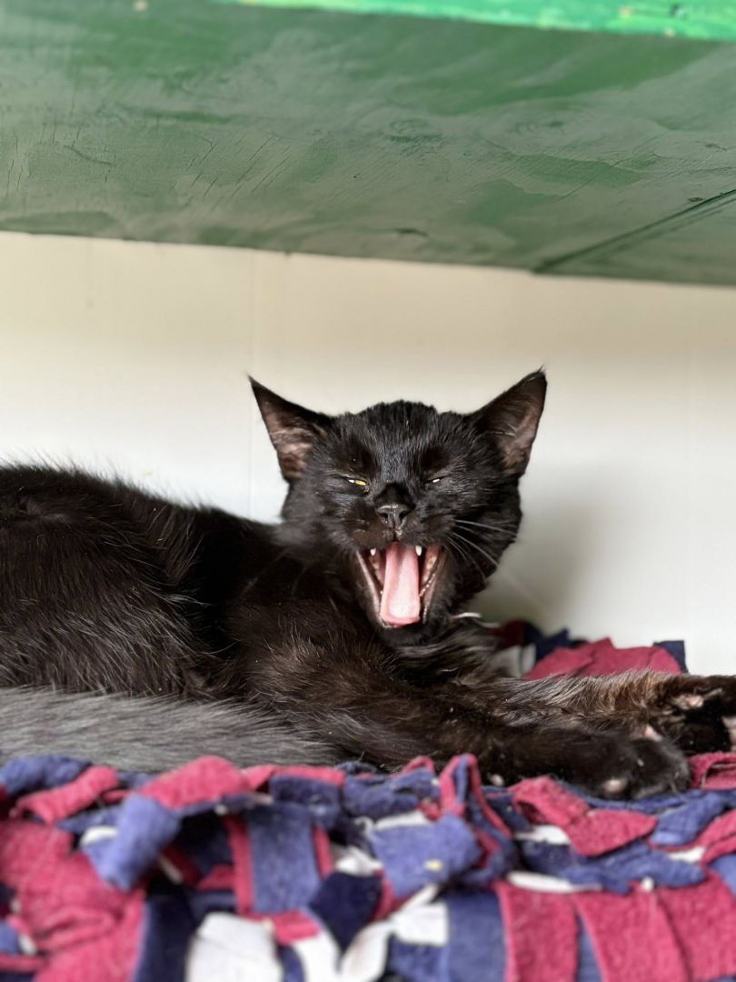 W schroniskowych warunkach żyje w zgodzie z innymi kotami.