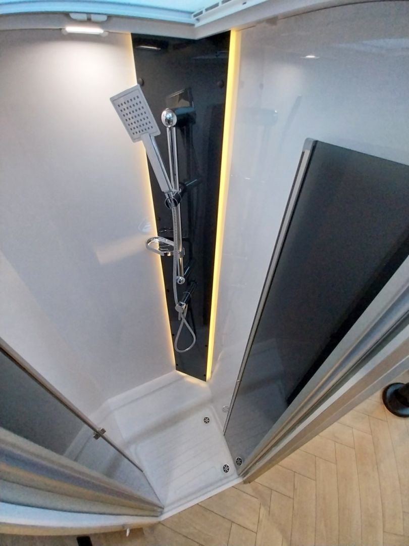 - TECHNIBOX - zabudowa wyposażona w boczną klapę serwisową gdzie znajdują się wszystkie najważniejsze elementy obsługi - skrzynka z bezpiecznikami, zawory spustowe, wlew czystej wody.
