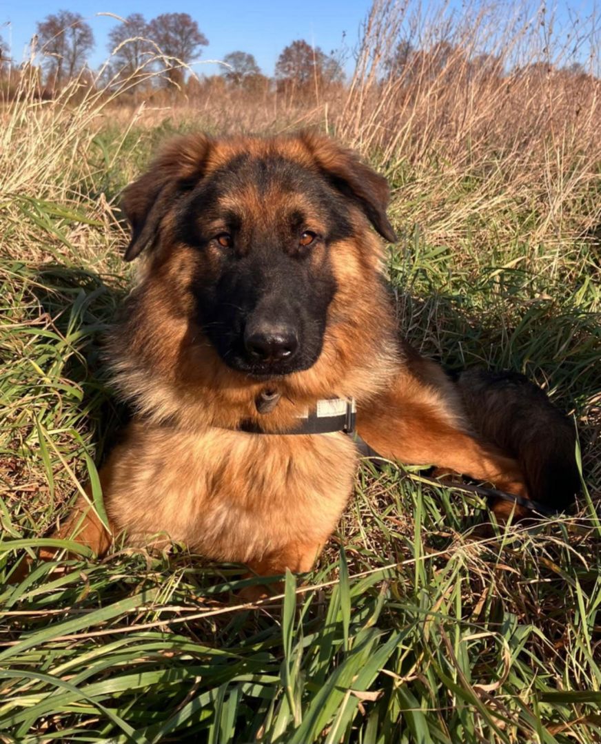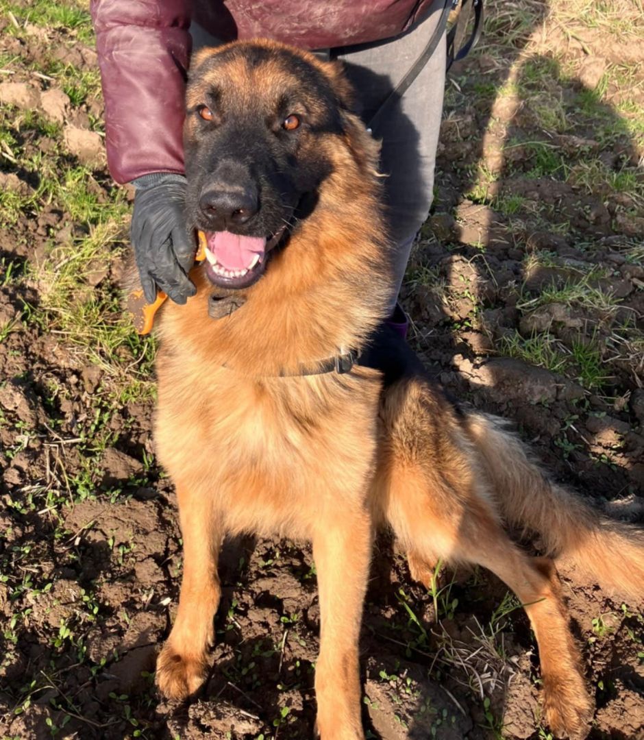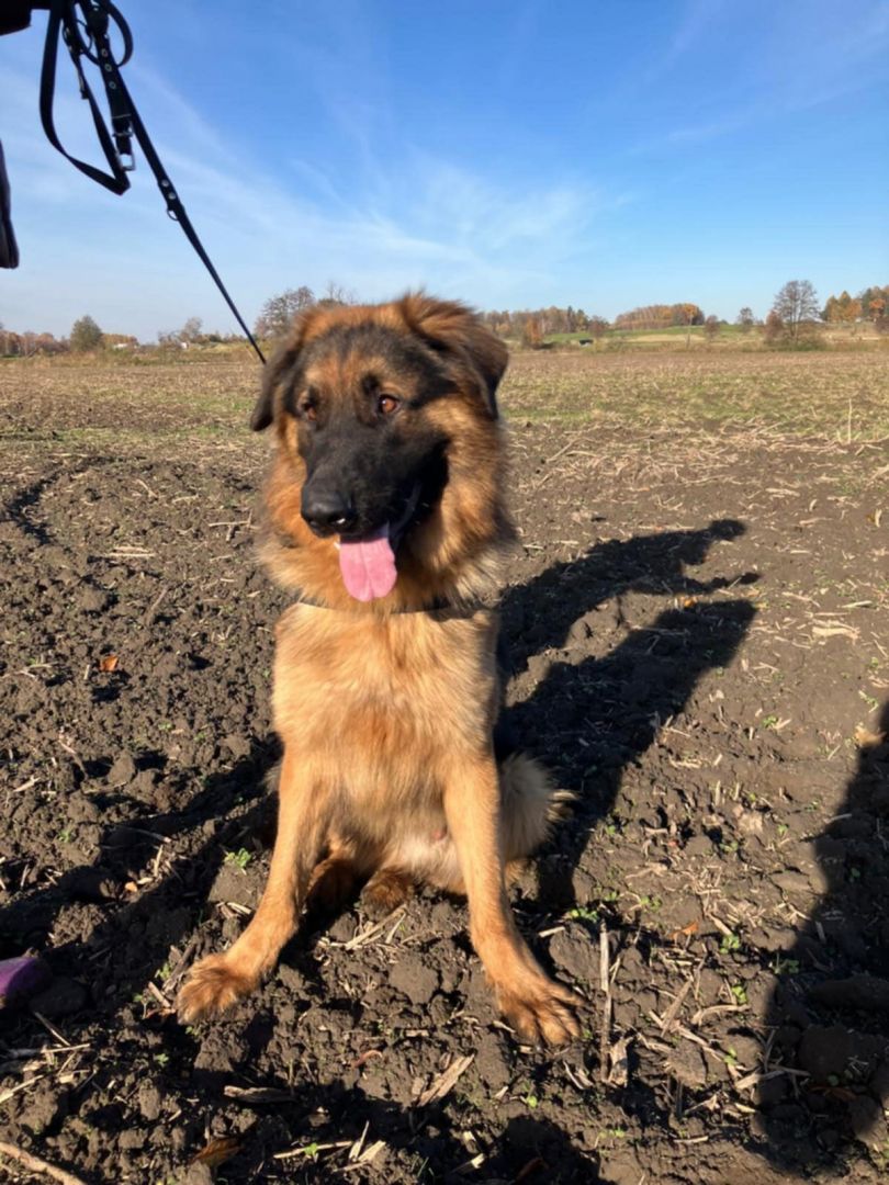 To młody chłopak w typie owczarka niemieckiego. Ma w sobie cały ich urok: mądrość w oczach, ogromne serce i chęć bycia blisko człowieka.