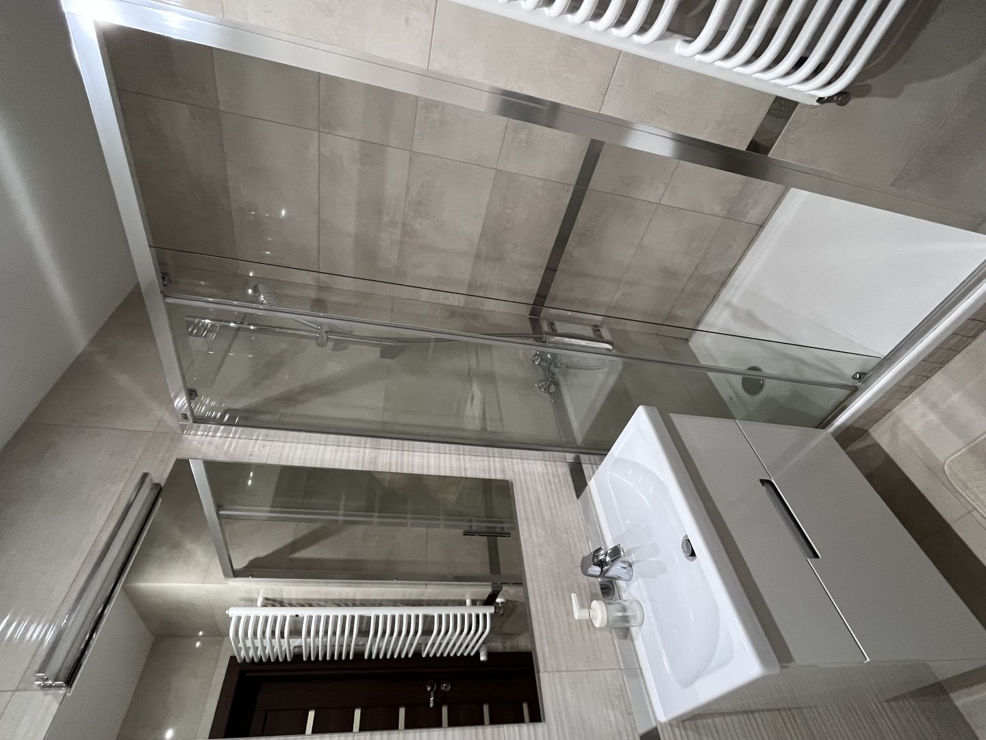 Kuchnia : meble w połysku pod pełną zabudowę , sprzęt: lodówko-zamrażarka , piekarnik , płyta indukcyjna, czajnik elektryczny. Dostępne garnki, talerze, sztućce.