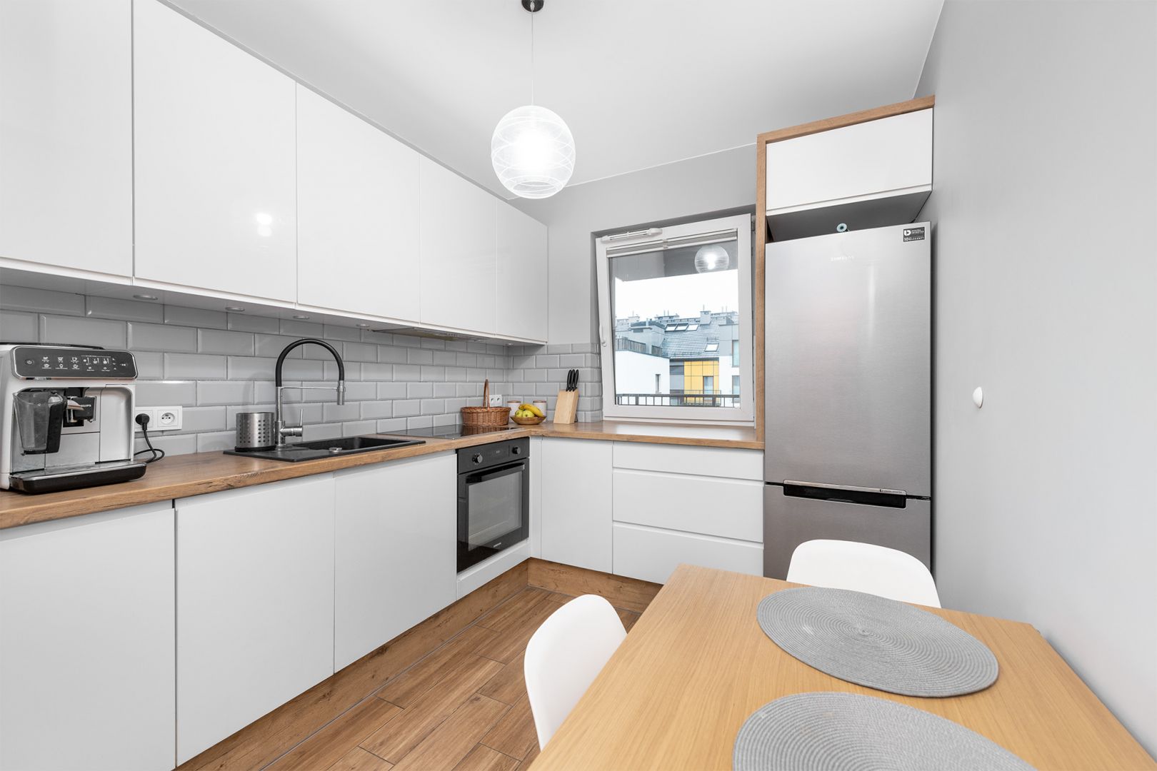 Oddzielna widna kuchnia w pełni wyposażona, meble wykonane na wymiar przez stolarza, wyposażona w płytę indukcyjną oraz okap, zmywarkę, lodówkę, piekarnik.