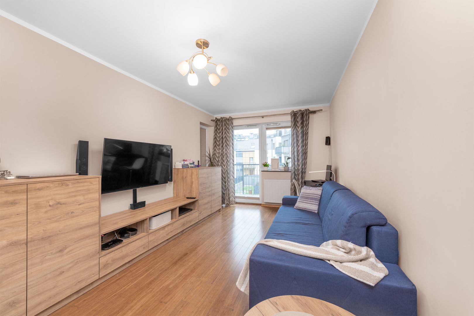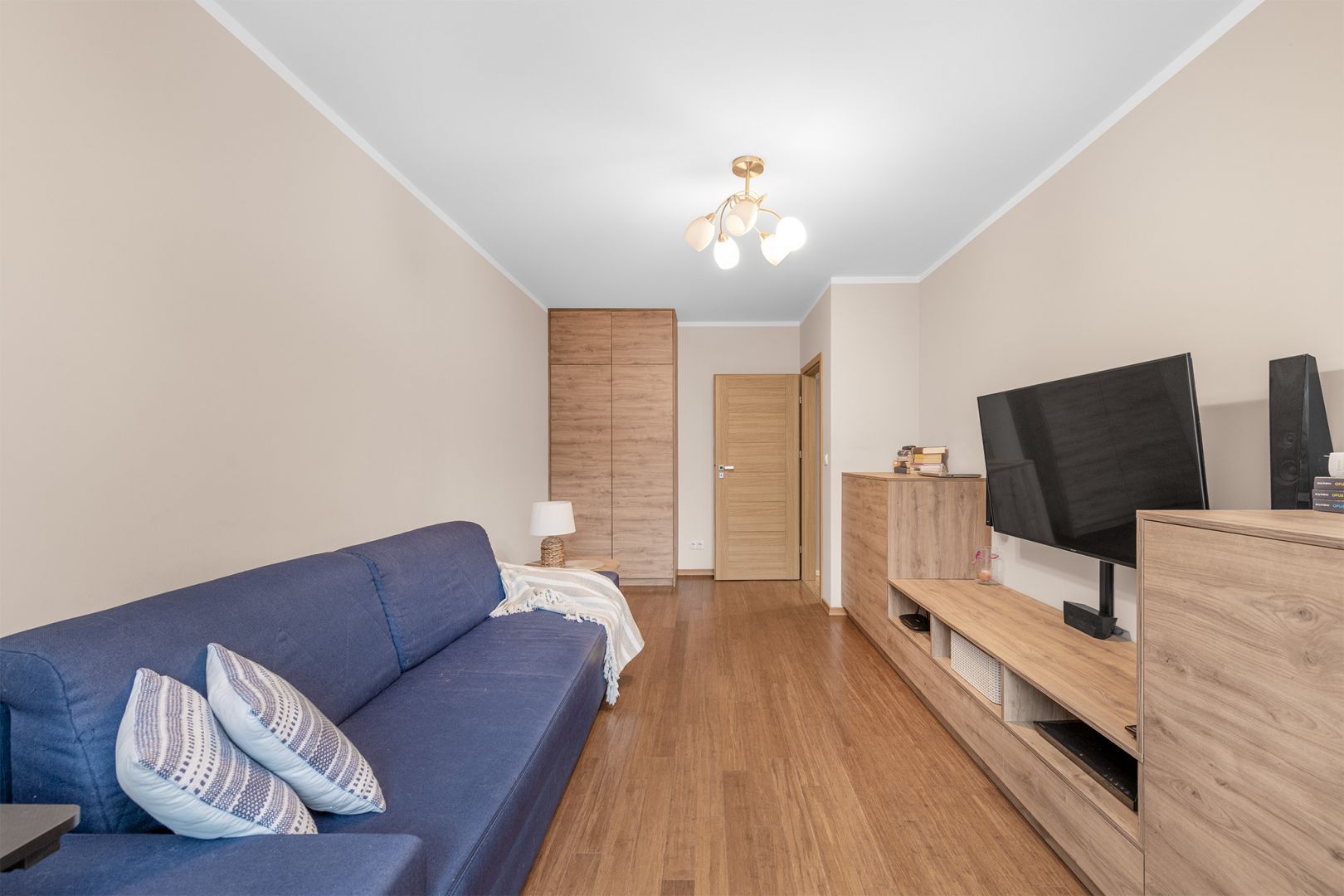 Salon: z dużą kanapą, przestronna szafka RTV i telewizorem, stolik kawowy oraz praktyczna szafa