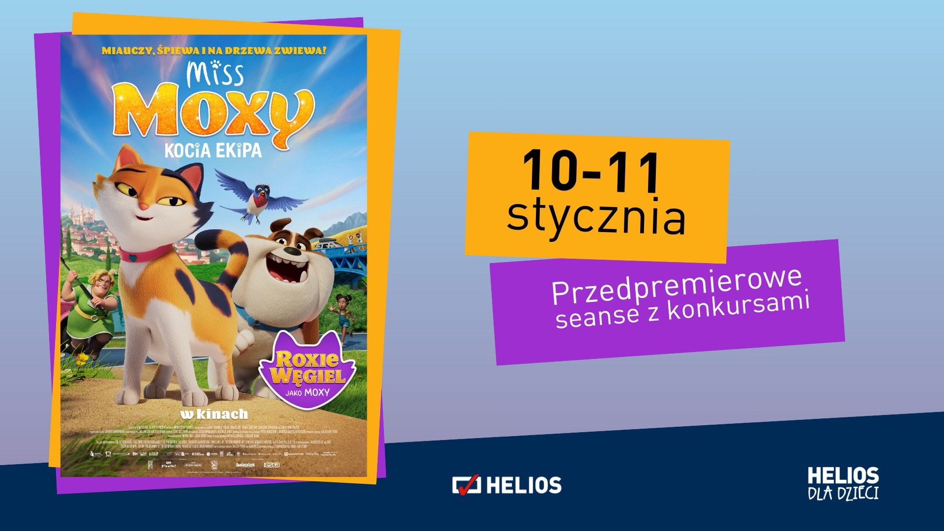 Kina Helios Wrocław Magnolia Park i Helios Wrocław Aleja Bielany w dniach 10-11 stycznia 2026 o godzinie 10:30 i 12:30 zapraszają na przedpremierowe seanse z konkursami „Miss Moxy. Kocia ekipa”.