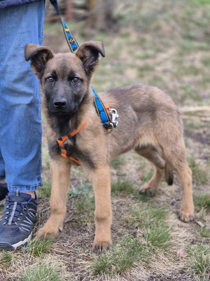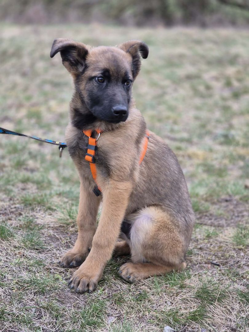 Będzie sporym psem. Ma w tej chwili 4 miesiące, waży 11 kg. Jego waga docelowa to tak spokojnie ze 25-30 kg. Jego mama wysoka, szczupła (na ostatnim zdjęciu) sięga do pół uda, tata zupełnie nieznany.