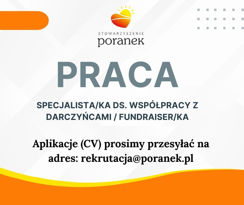 Aplikacje (CV) prosimy przesyłać na adres: rekrutacja@poranek.pl Informujemy, że odpowiemy tylko na wybrane zgłoszenia. W zgłoszeniu prosimy o krótkie uzasadnienie, dlaczego odnajdziesz się w pracy fundraisera i co Cię motywuje do wspierania działań społecznych?