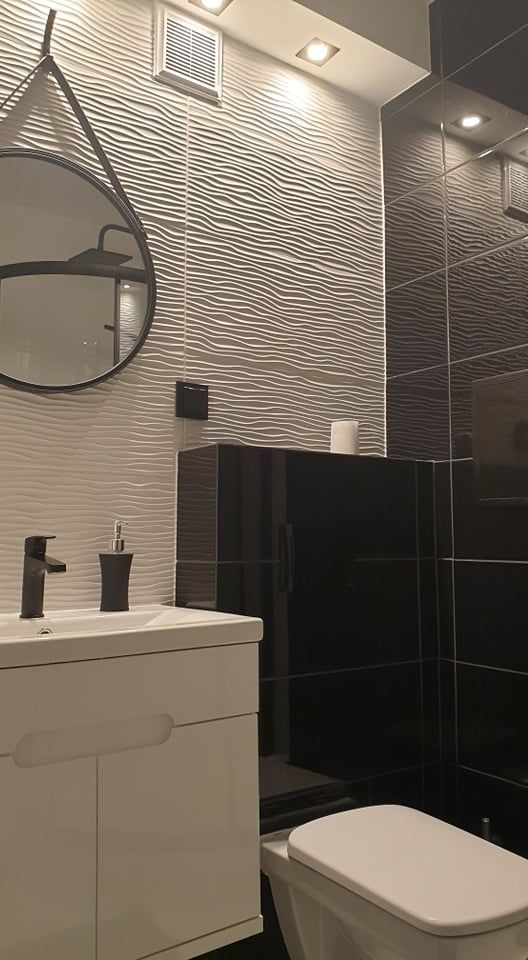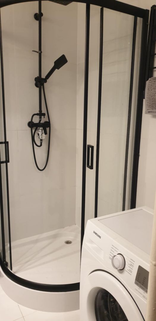 - łazienka z kabiną prysznicową, WC, umywalką i szafką+ pralka